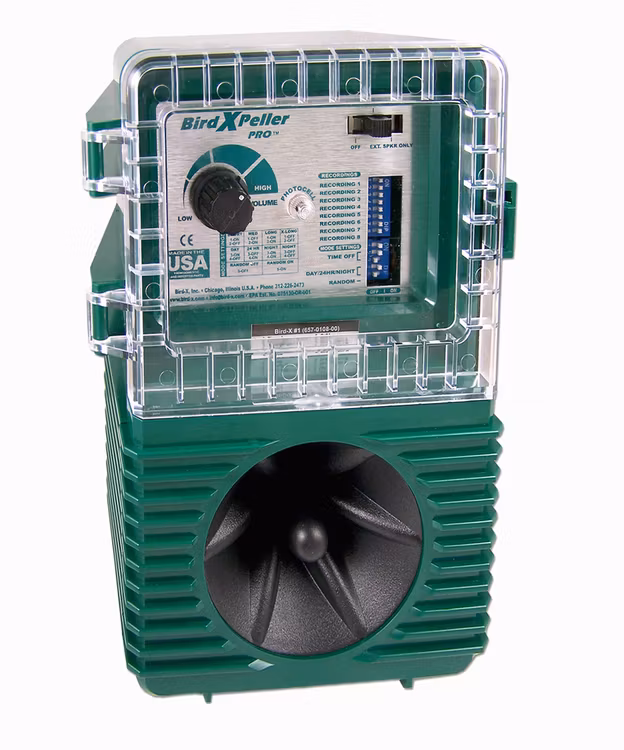 Experience Bird-X’s #1 BEST-SELLING sonic bird deterrent! TheBirdXPeller® PRO gets rid of birds by emitting a variety of naturally recorded distress calls and predator cries that confuse, frighten, and disorient pest birds.