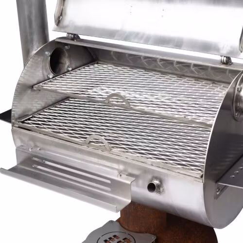 En klassisk BBQ-rökgrill med två skorstenar som ger underbara smakupplevelser. Handgjord av rostfritt stål. För att göra din grill kan du tända med både trä och grillbriketter. Dessutom kan den användas som en vanlig kolgrill. När du steker eller röker grill kommer värmen från eldstaden underifrån. Vid grillning används ett speciellt kolbad som placeras under grillristen.